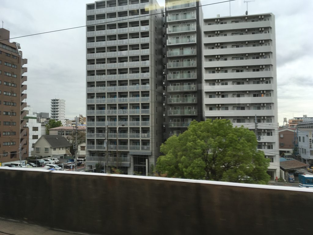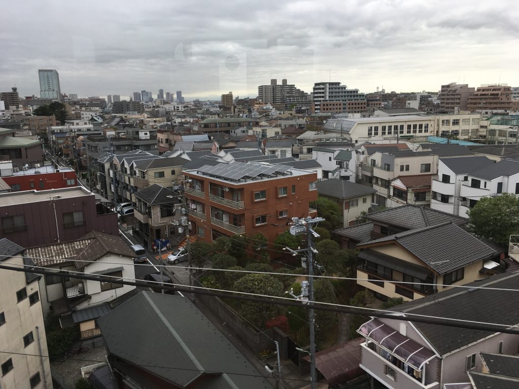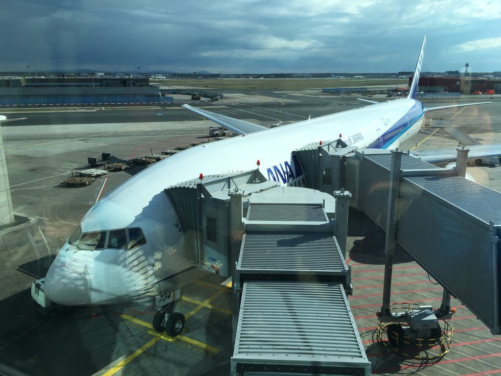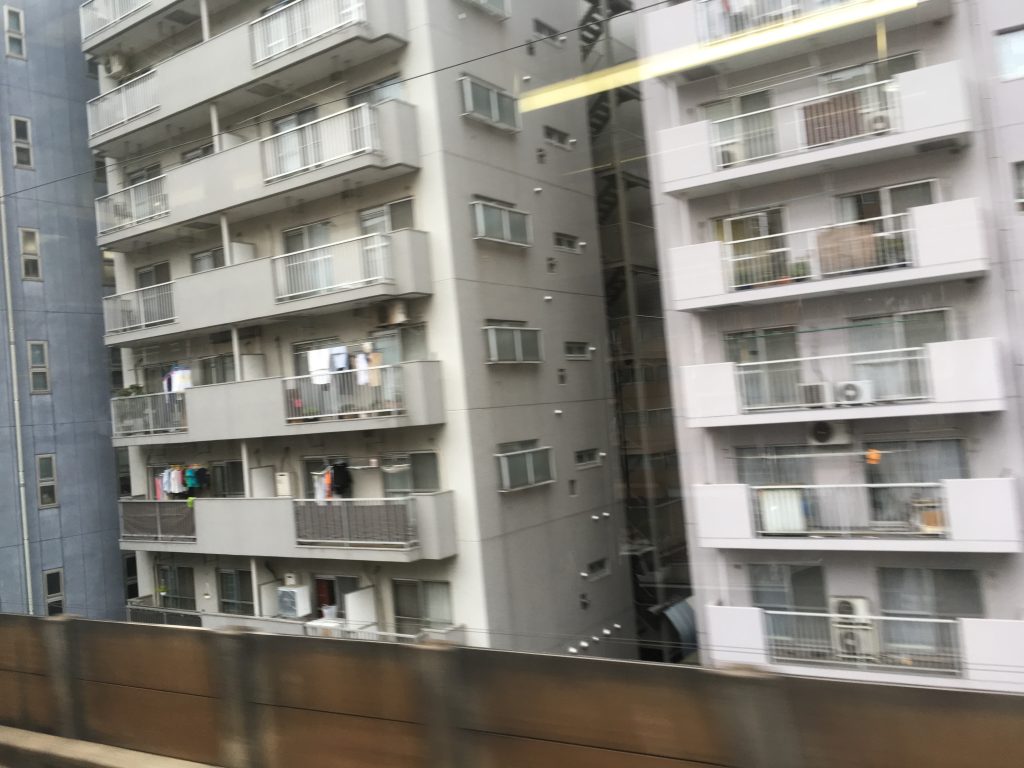Seit gestern wissen wir wie die Wohnungen geschnitten sind: Ein langer Schuhkarton mit einer Tür auf der einen kurzen Seite, daneben die Klimaanlage und ein Balkon auf der anderen Seite. Links und rechts keine Fenster nur bei den Außenwohnungen. Die Zimmergröße wird in Standard-Tatami-Matten gemessen: im Durchschnitt 6 pro Zimmer. Die Wohnblöcke sind bis zu 15 Stockwerke hoch und bis zu 20 Wohnungen breit. Bei neun Millionen Menschen in Tokio direkt (37 Millionen Menschen im Großraum) Zweidritteln der Fläche der Stadt Berlin haben die Menschen nur ein Viertel des Platzes. Zwei drittel der Fläche Japans sind Gebirge, nur 20% ist besiedelt. 80% der Fläche Japans sind Berge. Die 120 Millionen Japaner leben hauptsächlich in den flachen Gebieten an den Küsten. Während der Fahrt merke ich, dass wir zum Glück den richtigen Zug erwischt haben. Nur jeder zweite fährt nach Haneda. Wir sind so ins Spielen auf unseren Handys vertieft, dass wir bis zur Endstation durchfahren. Domestic Terminal. Eine zu weit. Wir wollten International raus. Also eine zurück. Der Rest ist ein Kinderspiel. Einchecken, Suica Karten zurückgeben und unseren treuen Begleiter das WiFi in den Briefkasten. Dann noch durch Security und Immegration.