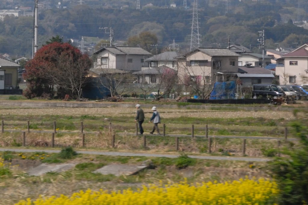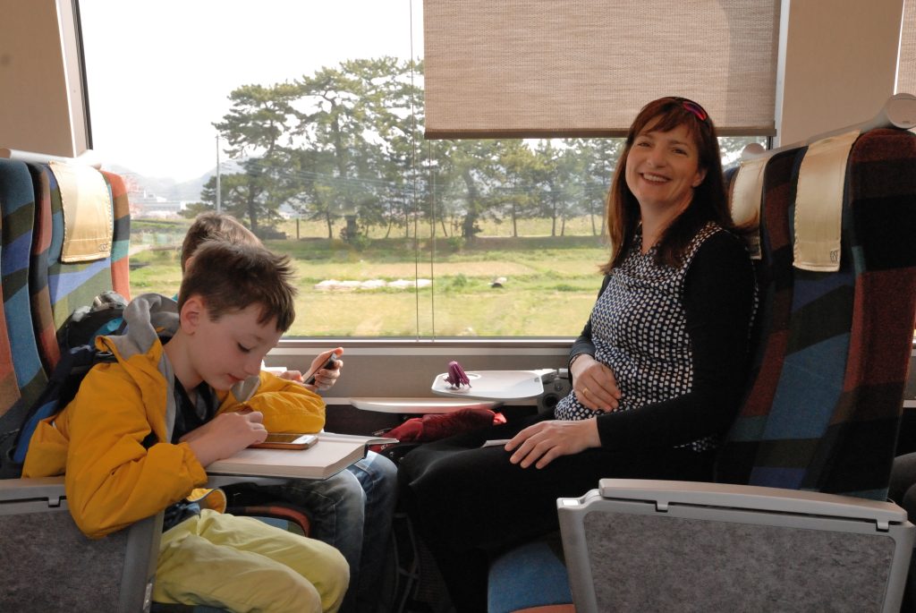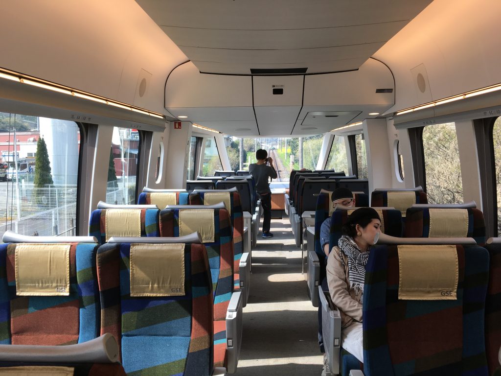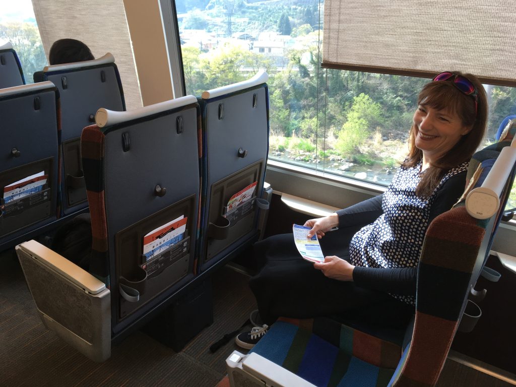 Japanisches Frühstück heißt „kein Kaffee“. Das geht gar nicht. Die Zugbegleiterin konnte mir auch keinen verkaufen, wollte aber warten, bis ich in Odawara einen Kaffee gekauft hätte. Irgendwie war mir das suspekt, und ich habe mich nicht getraut, für meinen Kaffee auszusteigen. Das Beste am Zug neben der Aussicht: Ich habe die Sitze gedreht, wir saßen einander gegenüber.