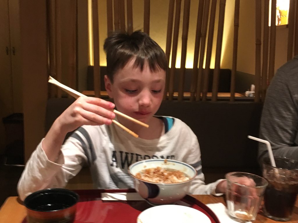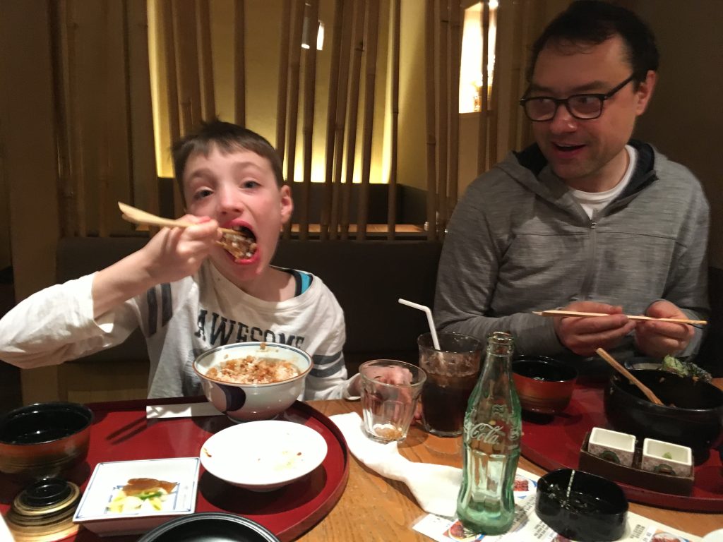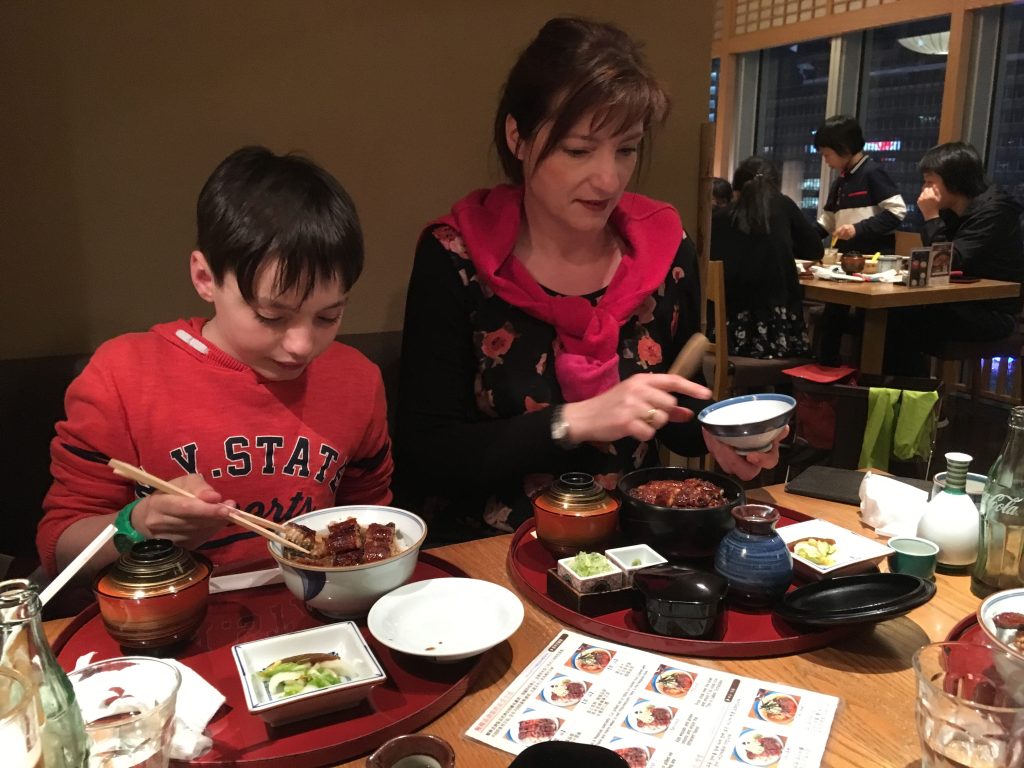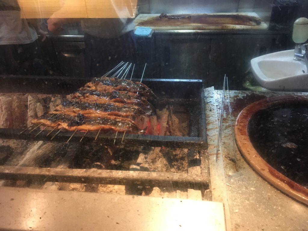 Für unser Abendessen steht eine Nagoya Spezialität auf dem Programm. Hitsumabushi, ein auf Holzkohle gegrillter Süßwasseraal. Der Aal wird während des Grillens immer wieder in eine spezielle Marinade getaucht, die dem Fisch den Geschmack gibt. Das ganze auf Reis mit einer kleinen Gemüsebeilage, Lauch, Kräutern, grünem Tee und Wasabi gereicht. Ein unbedingtes Muss in Nagoya.