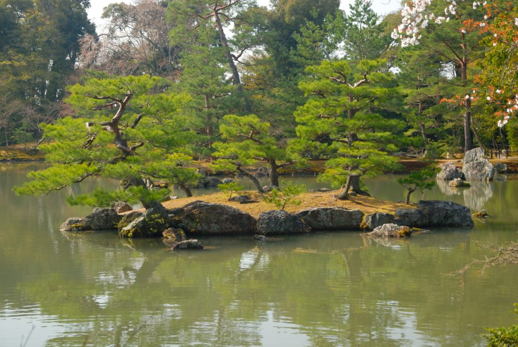 Die Besucher sind vom Anblick und den Mitbesuchern so beseelt, dass sich zum Ausgang hin Glücksbringer und Souvenirs sehr gut verkaufen. Auch hier wieder viele Menschen, die sich in einem unendlichen Strom am Pavillon vorbeischieben. Der Garten um den Pavillon ist fast noch schöner als das Gebäude selbst. Kein Detail scheint hier dem Zufall überlassen. Die Bäume brauchten sicher Jahrzehnte Pflege um ihre heutige Form zu erreichen.