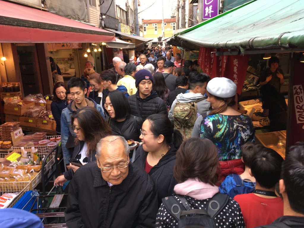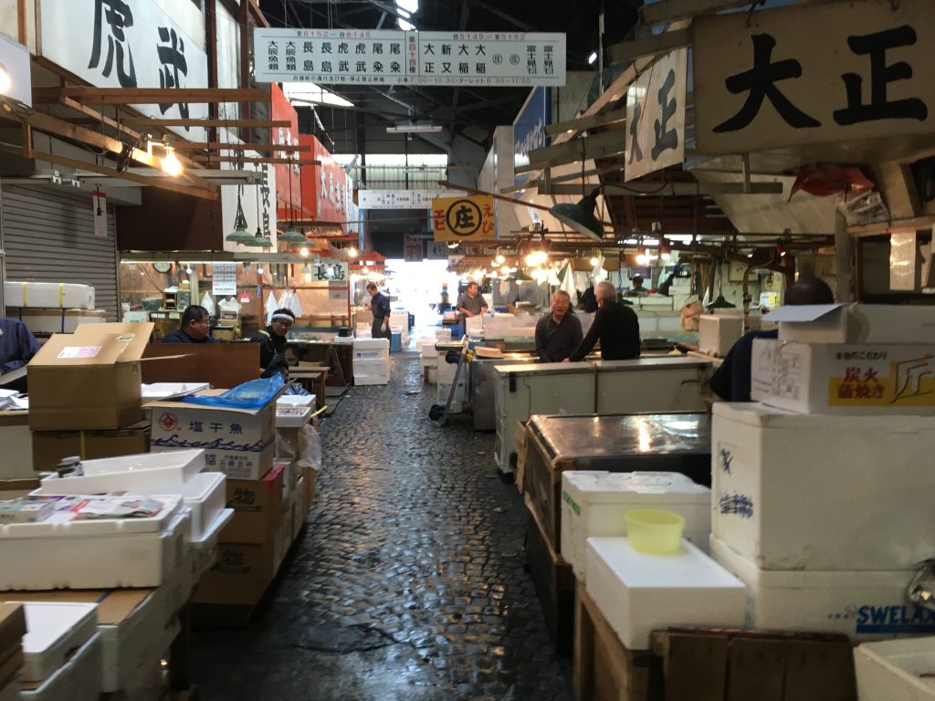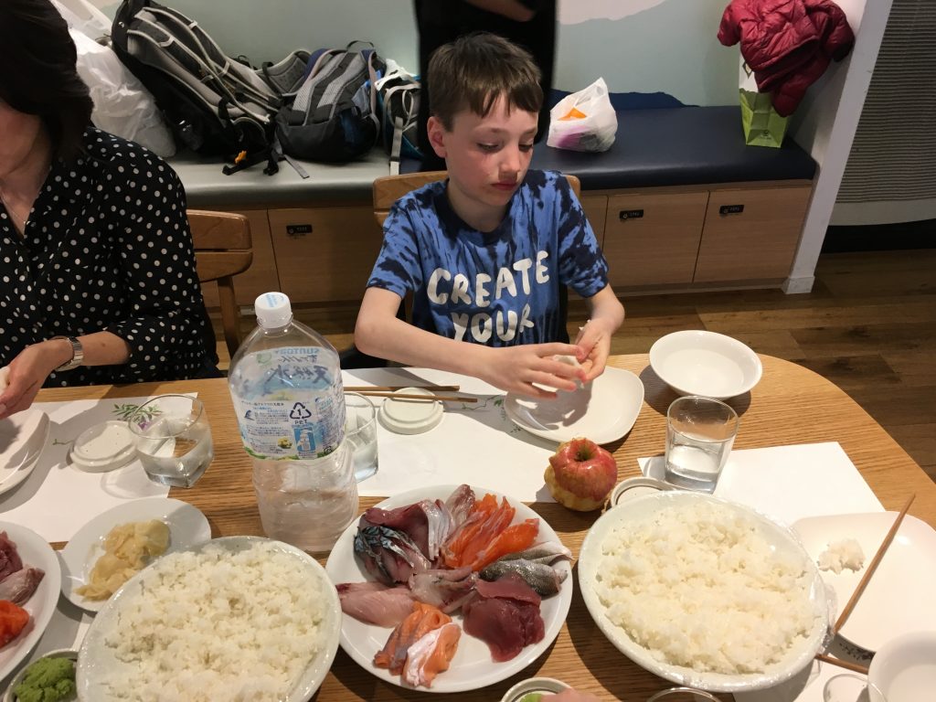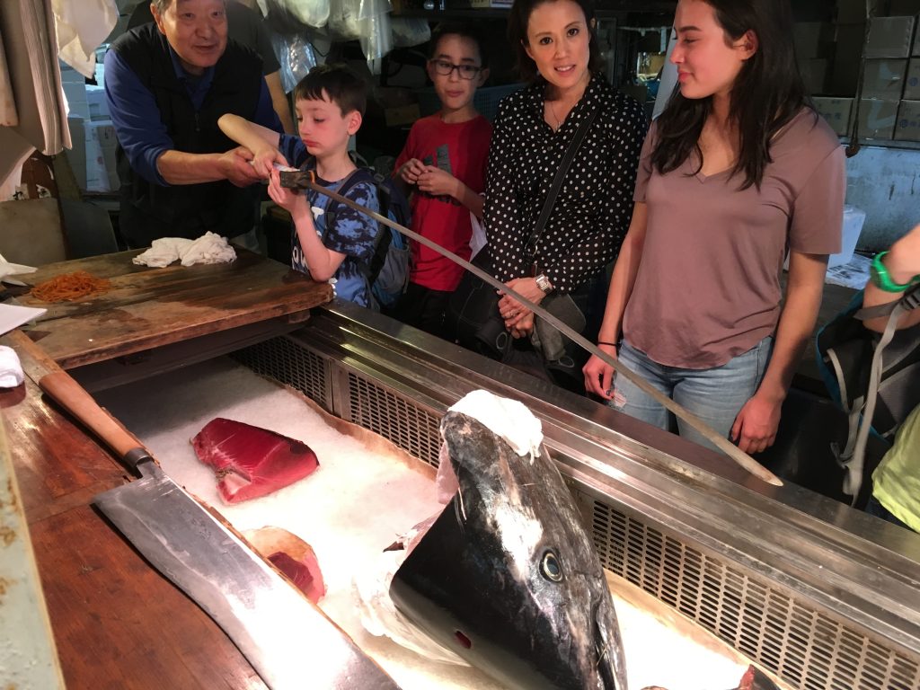 Um die Thunfischauktion im Tokioter Fischmarkt mitzuerleben geht man am besten erst gar nicht schlafen. 3 Uhr morgens werden die frisch gefangenen und die eingefrorenen Thunfische aus aller Welt meistbietend versteigert. Eingefrorener für 25 bis 50 Euro das Kilo und frischer Thunfisch für 50 bis 80 Euro das Kilo. Einzelne Fische können auch für wesentlich mehr über den Tisch gehen. Aber drei Uhr morgens war uns mit den Buben zu frühspät. Wir hatten stattdessen ein super europäisches Frühstück mit Kaffee und Orangensaft und eine echte Tokioter U-Bahnfahrt. Es ging niemand mehr in die Bahn, man hätte schon richtig pressen müssen.