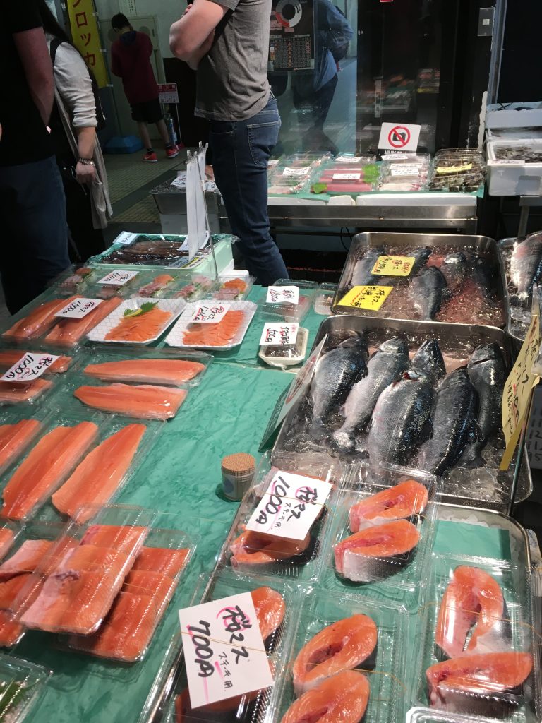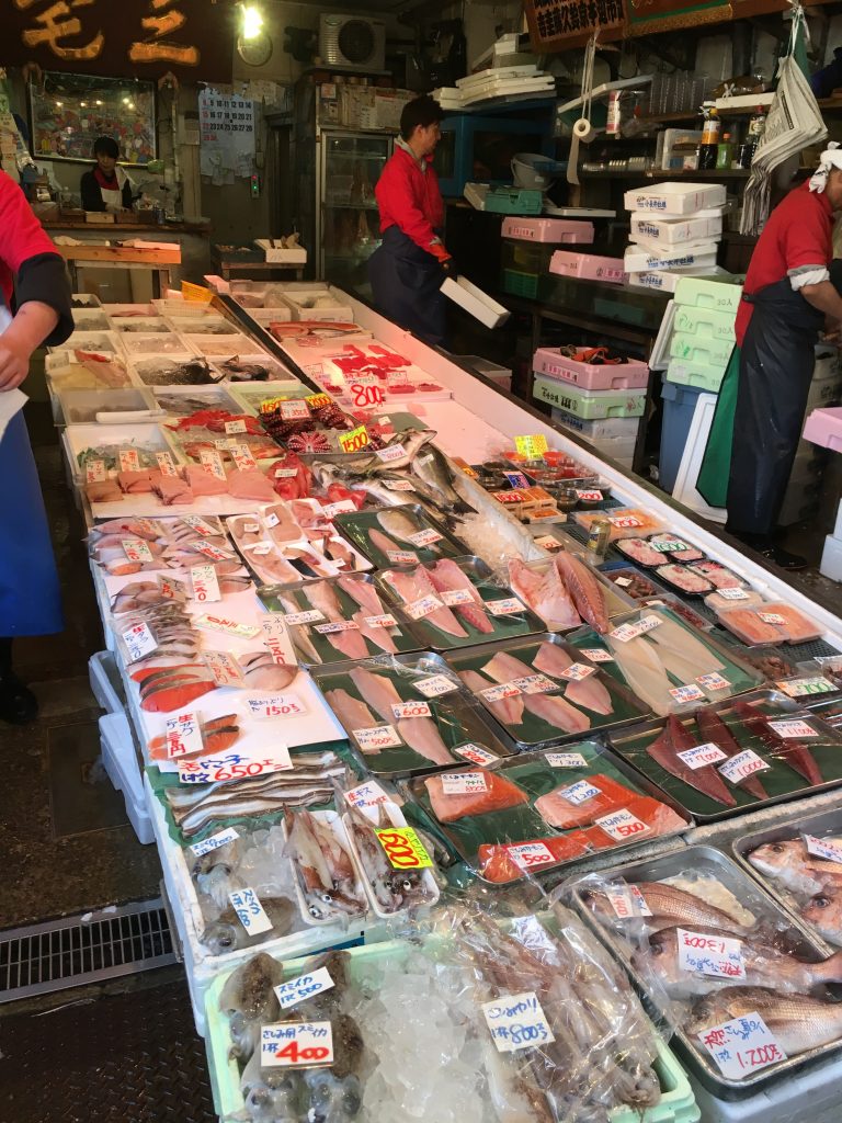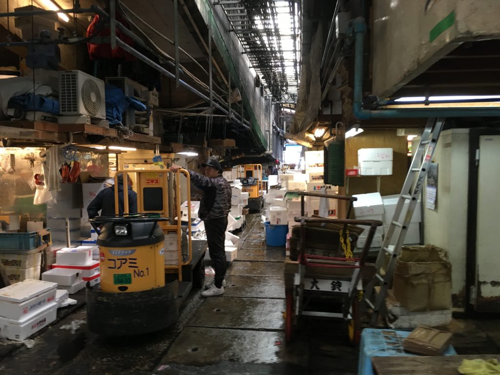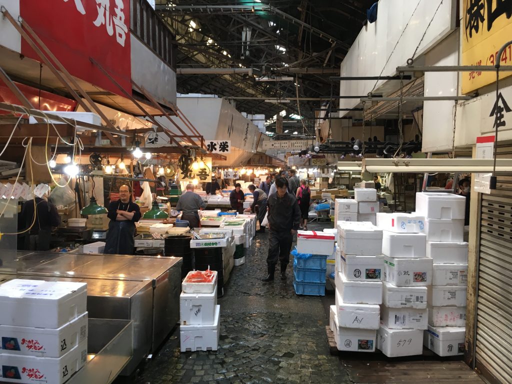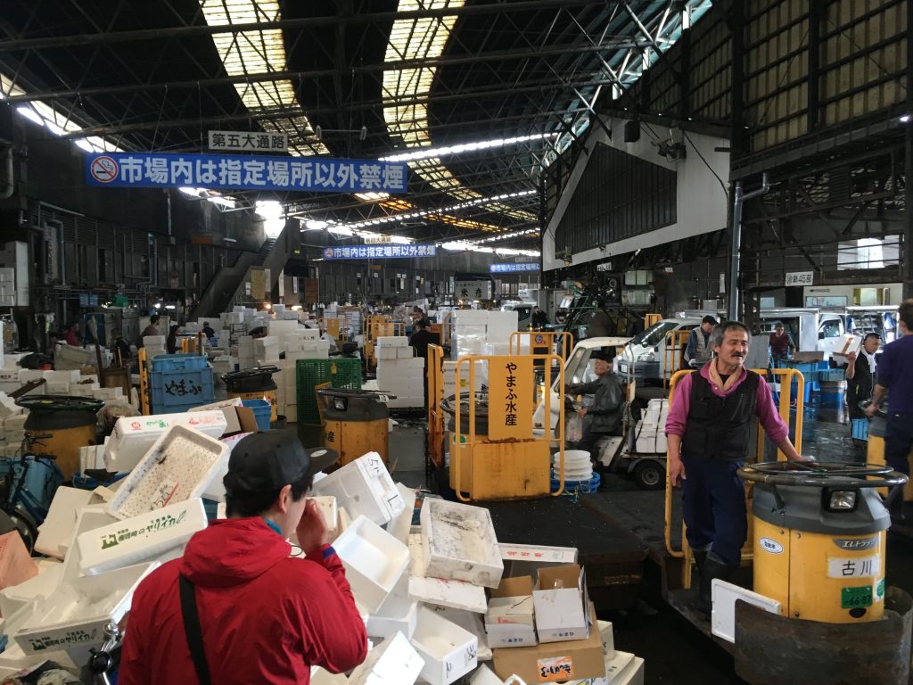 Um die Thunfischauktion im Tokioter Fischmarkt mitzuerleben geht man am besten erst gar nicht schlafen. 3 Uhr morgens werden die frisch gefangenen und die eingefrorenen Thunfische aus aller Welt meistbietend versteigert. Eingefrorener für 25 bis 50 Euro das Kilo und frischer Thunfisch für 50 bis 80 Euro das Kilo. Einzelne Fische können auch für wesentlich mehr über den Tisch gehen. Aber drei Uhr morgens war uns mit den Buben zu frühspät. Wir hatten stattdessen ein super europäisches Frühstück mit Kaffee und Orangensaft und eine echte Tokioter U-Bahnfahrt. Es ging niemand mehr in die Bahn, man hätte schon richtig pressen müssen.