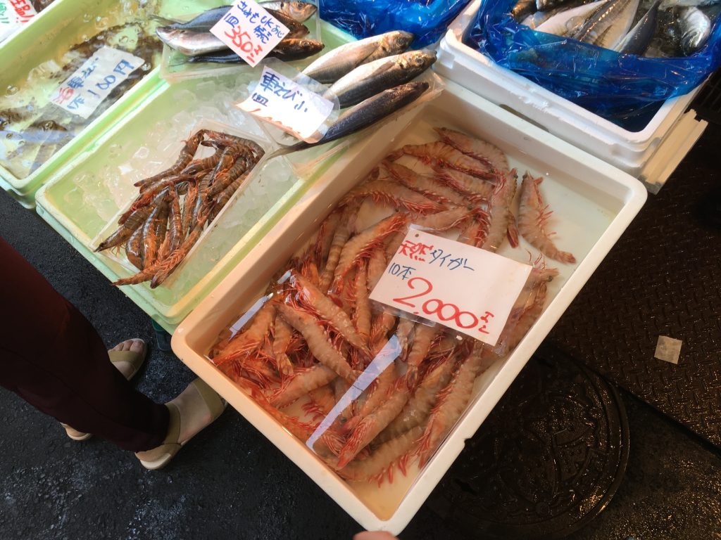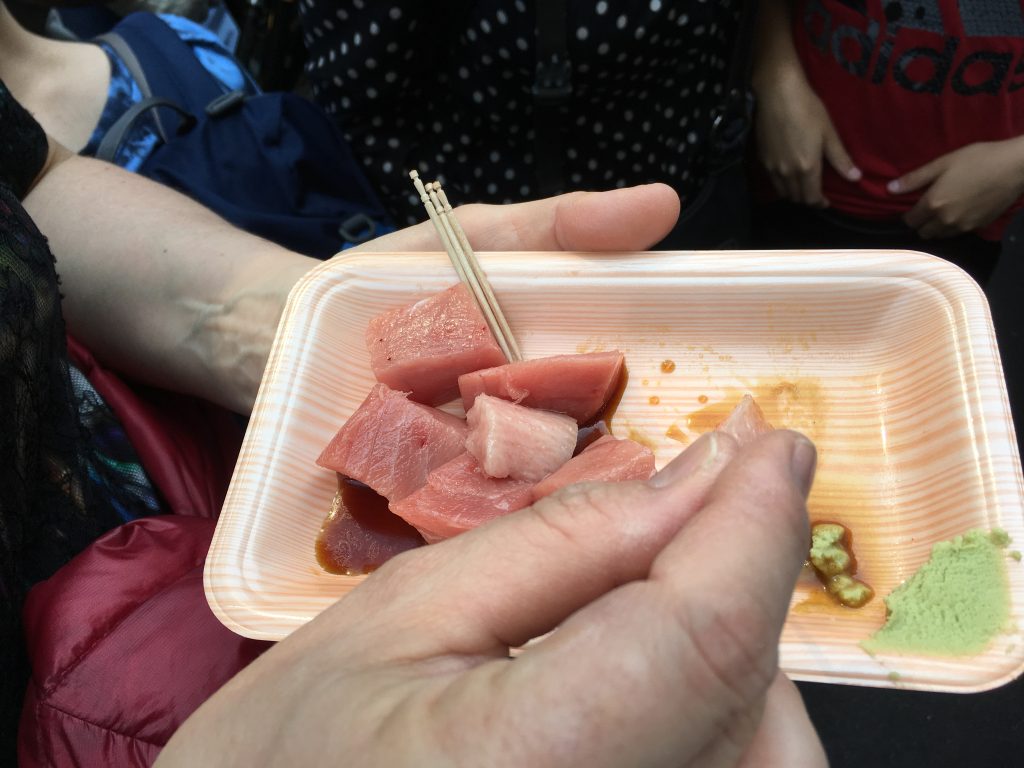 Unsere Fischmarkttour startete 9:00 Uhr. Führung durch eine echte Tokioterin und Begleitung durch eine Familie aus San Francisco, die zweieinhalb Jahre in Basel gelebt hat. Somit hatten wir ausreichend Gesprächsstoff. Wie klein doch diese Welt ist! Trifft man in Tokio zur Fischmarkttour eine amerikanische Familie die als Expat in Basel gelebt hat. Auf dem Fischmarkt gab es dann alles was man noch nie gesehen hat. Aufzählung spare ich mir. Birgit und ich haben uns eine Portion Thunfisch Sashimi gegönnt und Ricardo konnte an der im Haus gekochten Schnecke nicht vorbei gehen.