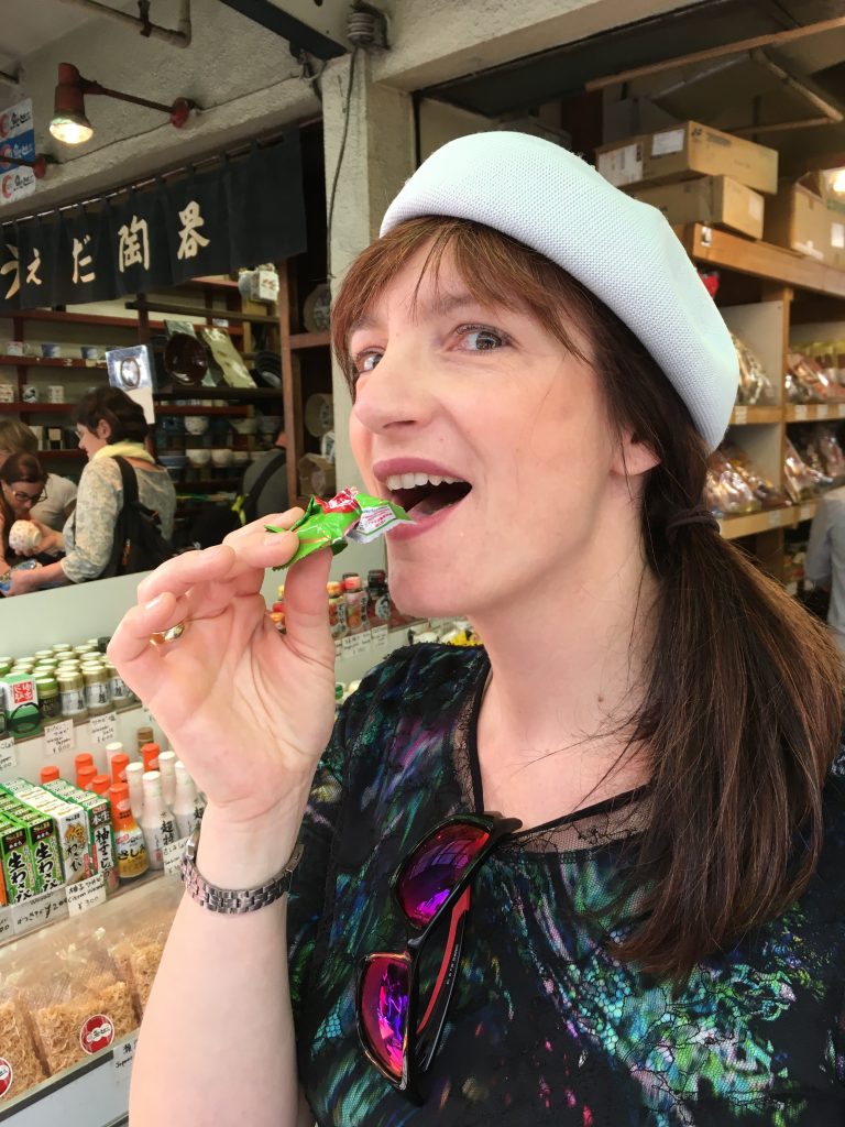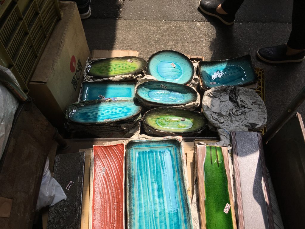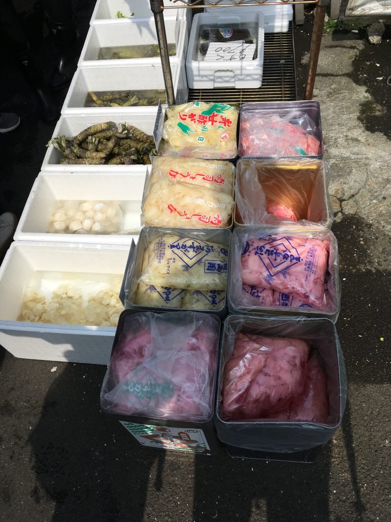Jetzt kennen wir auch den Unterschied zwischen gelben und rosa Ingwer. Der gelbe ist der bessere, er wird vorher gekocht. Falls man noch Tee, Sake oder Geschirr braucht: Auf dem Markt gibt es alles.