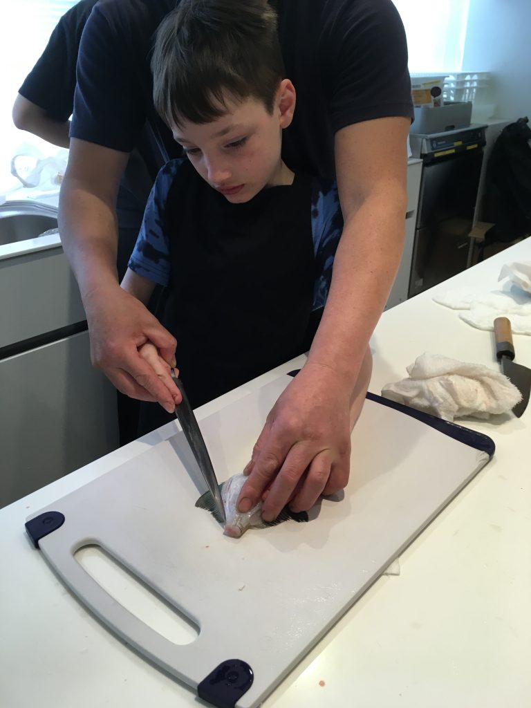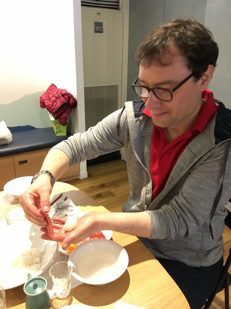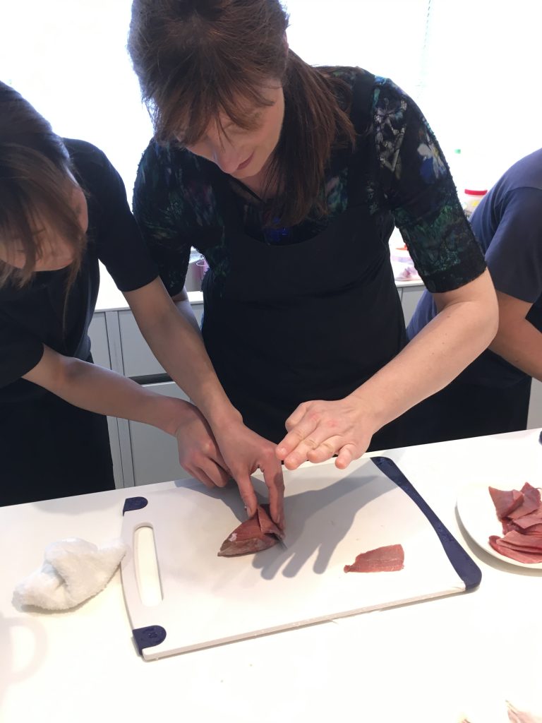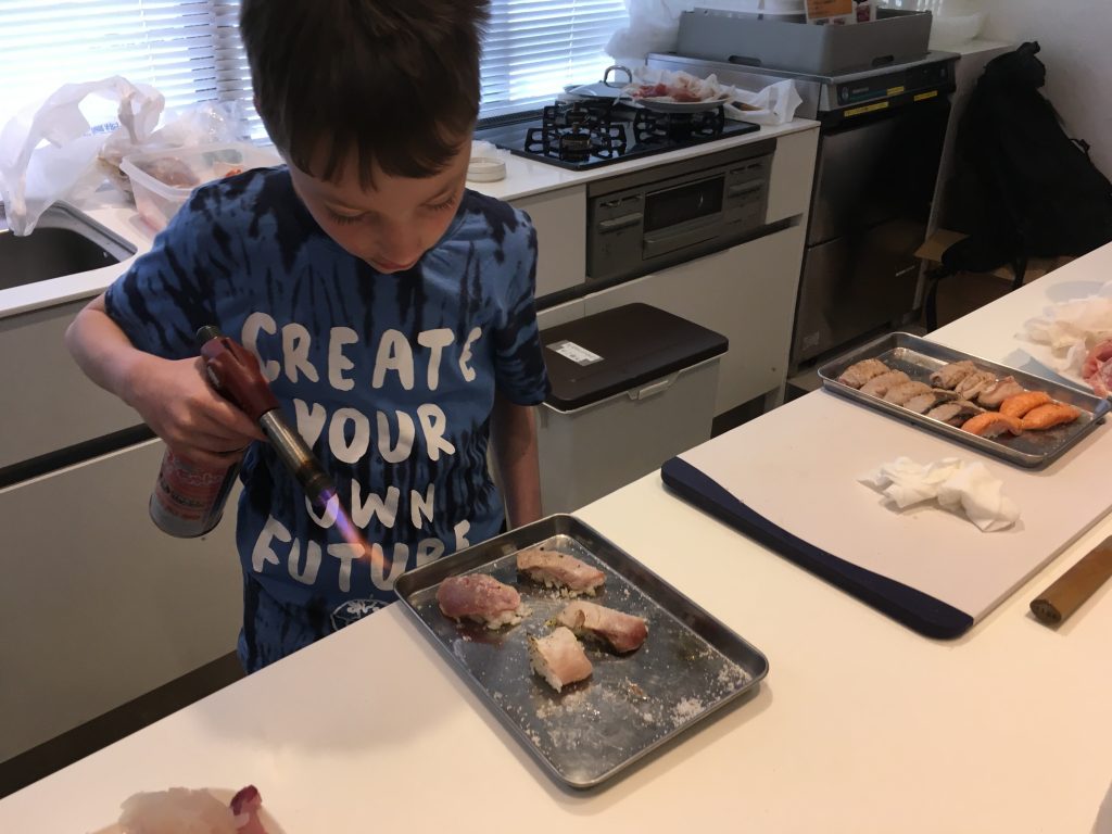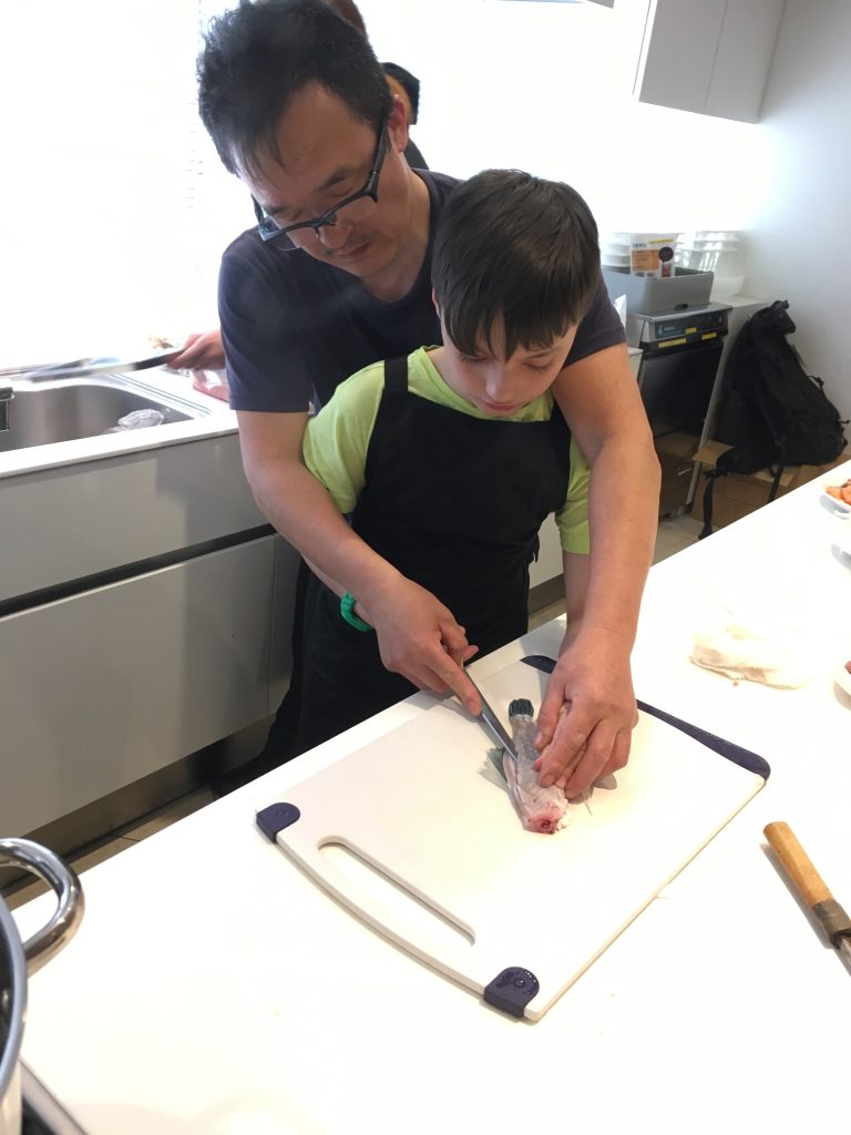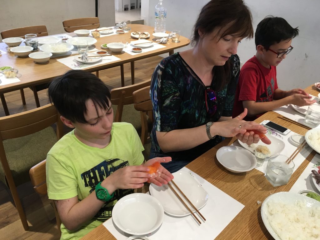 Unser Highlight kam nach dem Markt. Ein Sushi Machkurs. Gekocht wird ja nur der Reis, der Rest ist roh. 🙂 Mut haben unsere Jungs, sie wollten unbedingt zuerst einen Fisch filetieren. Birgit hat uns den Thunfisch aufgeschnitten.