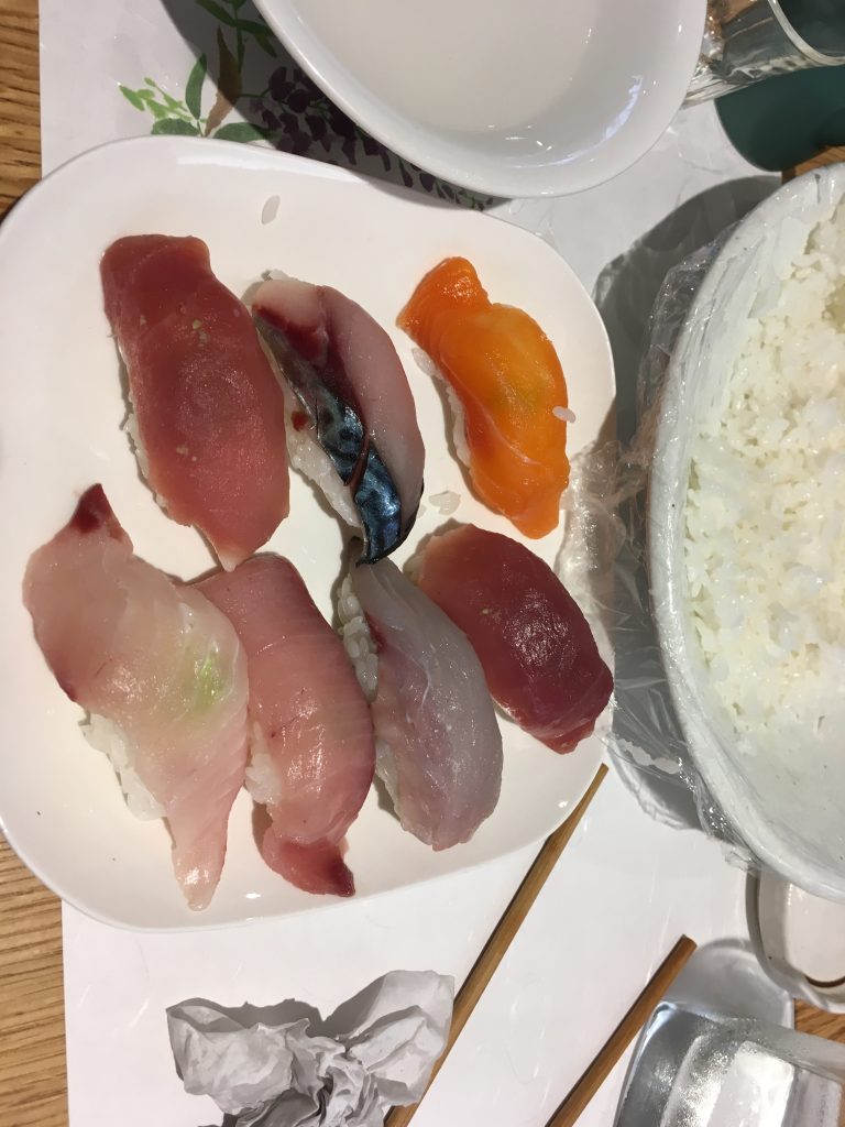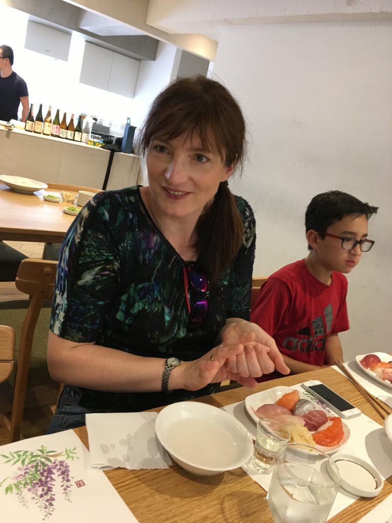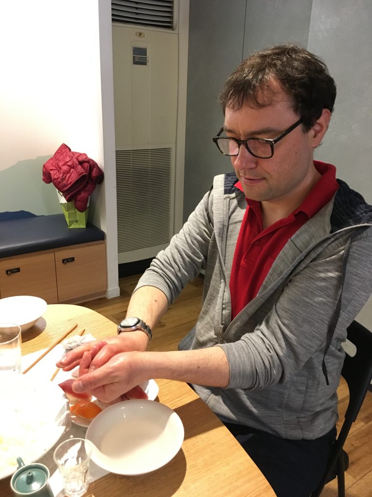 Heute habe ich auch gelernt, dass ich Sushi seit fast zwanzig Jahren falsch esse. Richtig ist: Erst nach links drehen, dann mit den Stäbchen greifen, nur den Fisch in Sojasoße tunken, der Reis löst sich sonst ja auf, haha, als ob man das nicht selbst herausbekommt, und dann den Fisch auf die Zunge, den Reis nach oben im Mund. So isst man Sushi. (Linkshänder drehen am Anfang nach rechts.) J Am Anfang dachte ich noch den Fisch muss man doch wegessen können, ging aber nicht. Mein Bauchdecke ist einfach nicht dehnbar genug.