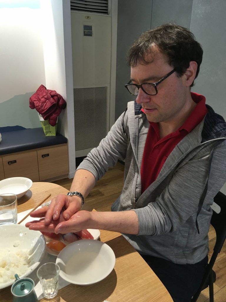 Danach ging es ans Machen. Und immer schön Wasser an die Hände sonst kriegt man den Reis nur noch unter fließend Wasser ab. Ich musste zweimal Hände waschen gehen.
