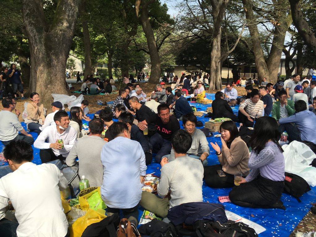 Als unsere Führung und der Sushikoch Feierabend machen wollten, sie waren ja auch schon seit 2 Uhr auf den Beinen, haben sie uns in den Fahrstuhl gerollt und nach unten versandt. Nach ein paar Rollen vorwärts konnten wir auch wieder laufen. Unser Deal mit den Kindern war: Sushi Kurs für uns und Tierpark danach für die Kinder. Die U-Bahn hat uns nach Ueno gebracht und unsere Füße zum Tierpark. Im Park herrschte Volksfeststimmung. An Wegkreuzungen konnte man Planen ausfassen. Damit beansprucht man ein Stück Park und picknickt mit Freundin oder Freunden.